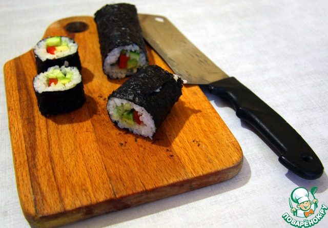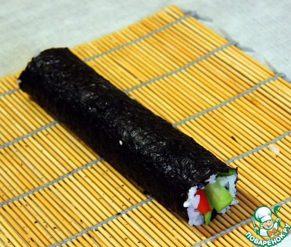 На циновку выкладывам лист нори шершавой стороной наружу - будем сначала готовить овощной ролл. Длина нори должна быть около 15 см. Если лист больше, его нужно обрезать. В противном случае роллы получатся "здоровыми" и будут завернуты "улиткой".