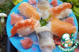 Готовим нужную посуду для подачи сета, а также имбирь, васаби и соевый соус. Соус, чтобы он был не слишком соленым, разбавьте кипяченой водой (по вкусу).