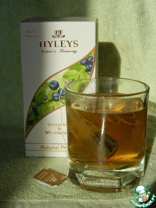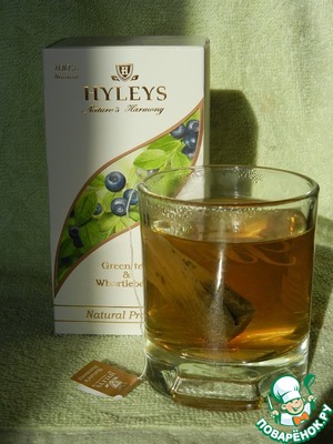 Для этого коктейля я выбрала зеленый чай HYLEYS с черникой из коллекции «Гармония природы». Это зеленый байховый чай, который содержит кусочки черники. Считается, что он способствует улучшению зрения. Итак, начнем. Заливаем пакетик кипятком, завариваем и охлаждаем.