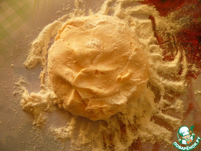 Добавляю частями сахарную пудру. Когда ложкой мешать уже тяжело, надо массу выложить на посыпанный сахарной пудрой стол. |
