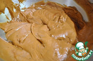 Всыпаю все оставшиеся сухие ингредиенты, перемешиваю, добавляю масло, немного разогретое в микроволновке, но оно размягченное, а не расплавленное. В заключении добавляю соду гашеную уксусом.