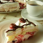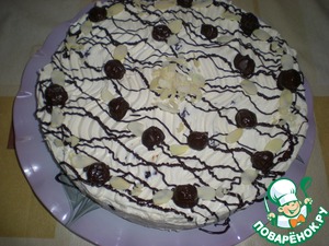 Украсьте торт вишнями в шоколаде, миндальными хлопьями, шоколадом.