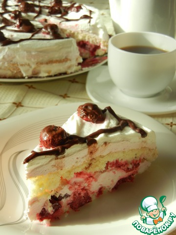 Бисквит разрежьте на 2 части по горизонтали. Уложите первую часть в разъемную форму. Выложите на нее половину творожно-вишневого крема. Накройте второй половиной бисквита и выложите сверху остальной крем. Уберите торт минут на 30-40 в холодильник.