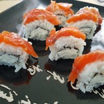 Лосось нарезать тонкими ломтями и выложить поперек бруска на бамбуковом коврике вплотную друг к другу, после чего завернуть в них ролл, чтобы он целиком был покрыт рыбой. Рыба должна облегать ролл плотно, поэтому при заворачивании необходимо слегка нажимать на коврик.