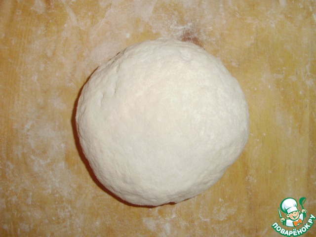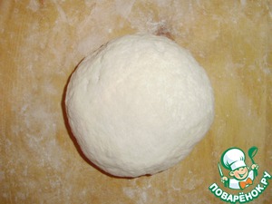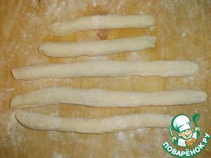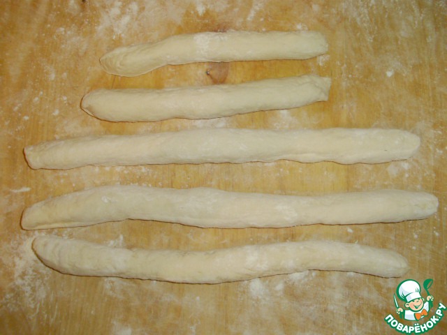Готовое тесто нарезаем на колбаски и посыпаем мукой.