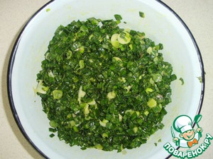 Готовим начинку (лучше приготовить заранее). Зеленый лук мелко шинкуем, засыпаем в тарелку, туда же добавляем яйца, манную крупу и соль по вкусу. Если начинка жидковата, манки можно добавить еще.