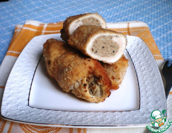 Оставшиеся ломтики куриного филе тонко отбиваем, солим, выкладываем на них фарш и сворачиваем рулетиком.