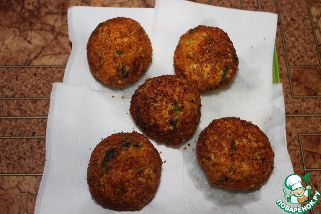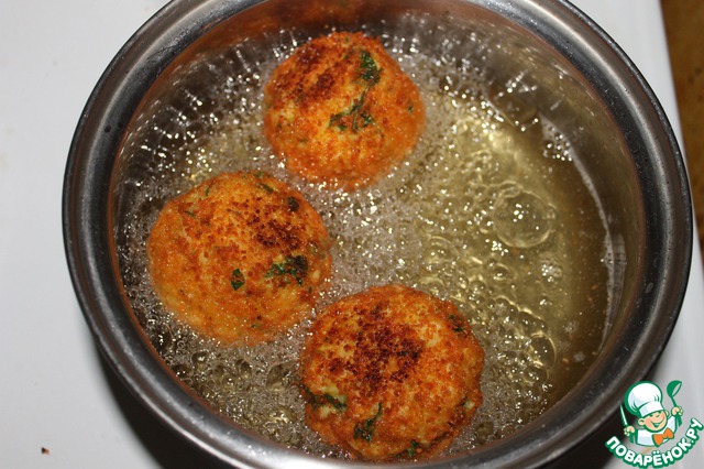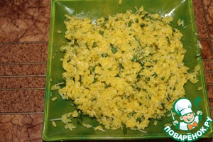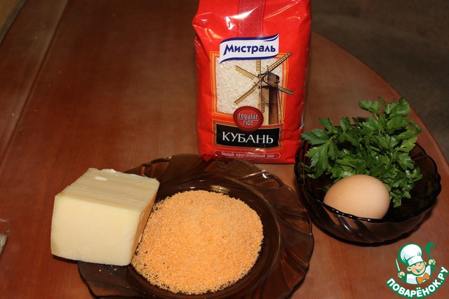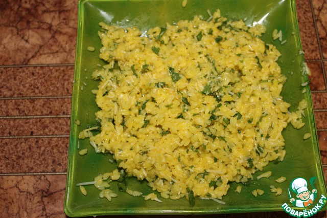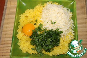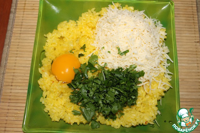 Рис охладить и добавить к нему тертый на мелкой терке сыр, рубленую петрушку, яйцо