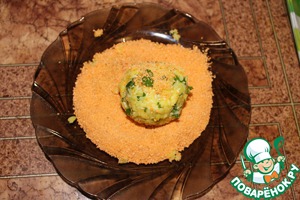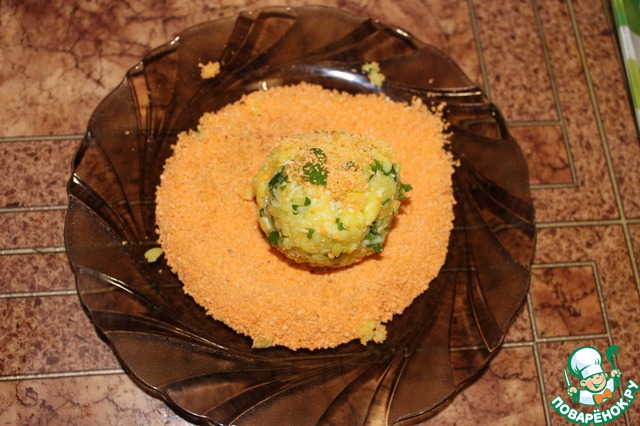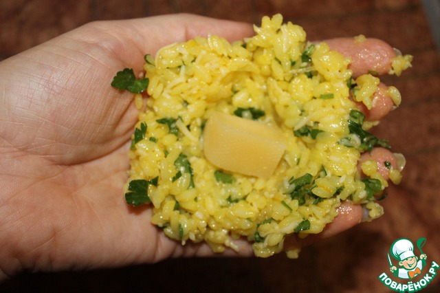 Делаем из готовой рисовой массы лепешечку и кладем в серединку кусочек сыра. Скатываем шарик.
