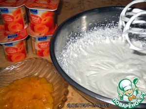 С банки с абрикосами слить сироп (он еще понадобится) и половину абрикосов мелко порезать. Другую половину отложить. Мелко порезанные абрикосы перемешать с кремом.