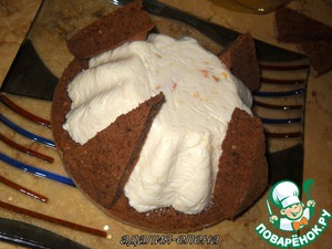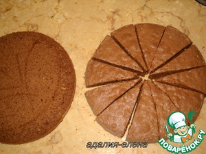 Как только крем застынет, начинаем собирать торт. Бисквит разрезать по горизонтали на 2 коржа. Один корж пропитать сиропом. Другой корж разрезать на 12 частей.