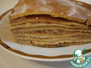 Я делала блинчатый пирог. Напекла тонких блинчиков по рецепту http://www.povarenok .ru/recipes/show/529 56/ "Кружевные блинчики ". Смазала их паштетом и поставила в духовку на 20 минут. Так делала в первый раз и осталась очень довольной. «Пирог» я ничем не закрывала, а в следующий раз попробую закрыть сверху фольгой.