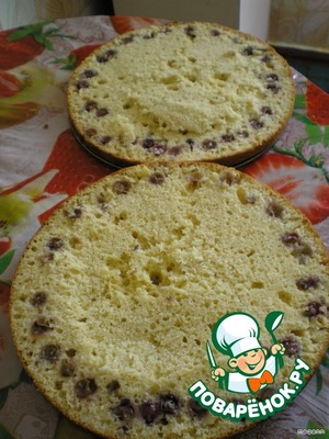 В этот раз я вылила в форму половину теста разложила ягодки винограда по кругу и вылила оставшееся тесто. Выпекать в горячей духовке 20 мин. Даем остыть и разрезаем пополам. Пропитать клубничным сиропом, разбавленным водой.