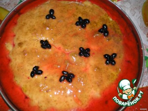 Верх украшаем ягодками черной смородины и заливаем желе для торта. Ставим в холодильник до застывания – у меня ушел час.