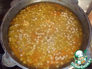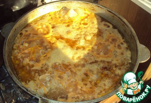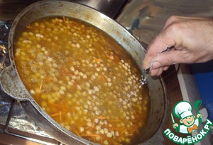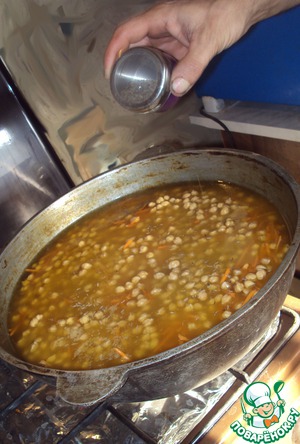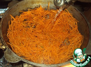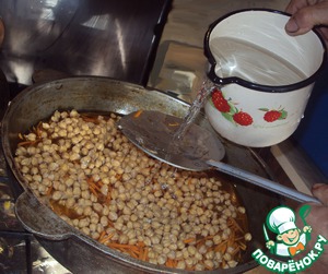 Равномерно распределив, заливаем водой через шумовку на 1.5-2 см, еще раз добавляем соль и тмин и пусть кипит на сильном огне, пока не выкипит вода