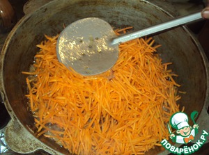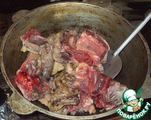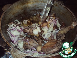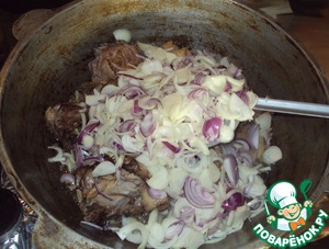 Как подрумянится мясо, добавляем лук и обжариваем 15-20 мин.
