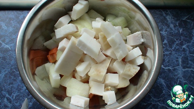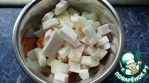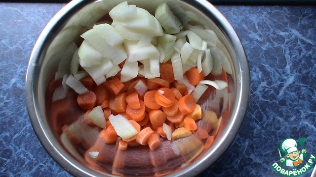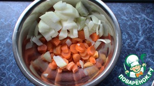 • Сырые лук и морковь нарезать кубиками средней величины.