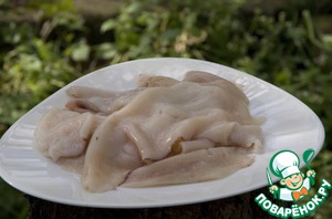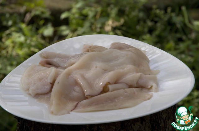 Почистить кальмар и удалить плёнку, промыть. Разрезать на полоски 5х2 см.