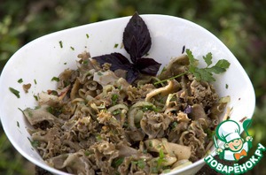 Перемешать кальмар с коралловым грибом, добавить мелко нарезанную петрушку и базилик, добавить соли или соевого соуса по вкусу.