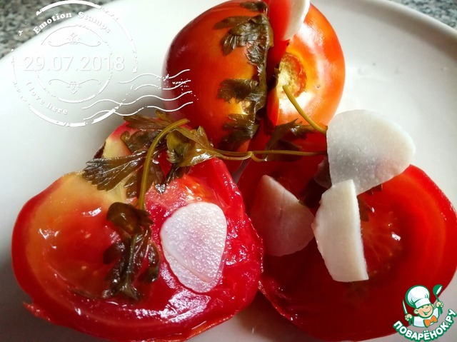 Очень вкусные помидоры с чесноком и петрушкой, которые готовы уже через пару дней.