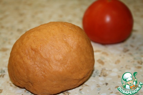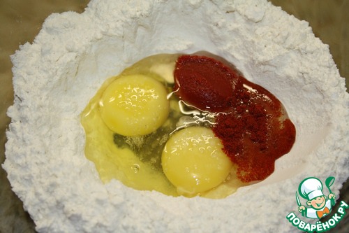В муку разбить два яйца, добавить томатную пасту, паприку, масло и соль. Сначала размешивать вилкой, начиная с середины, затем понемногу прихватывая муку с краев, когда масса станет однородной, вымесить тесто. -