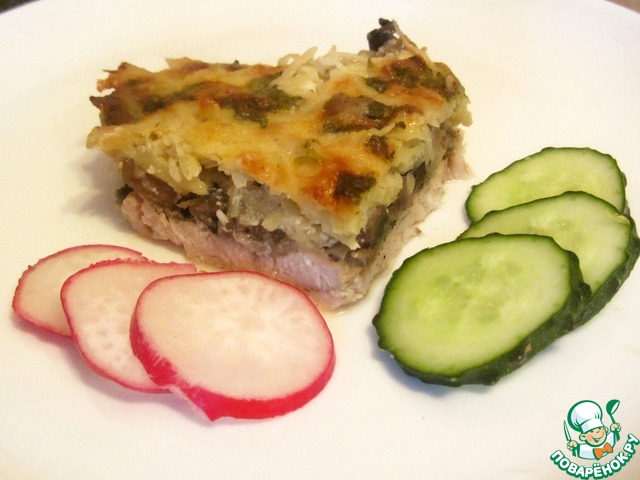 Готовые грибы с луком выкладываем на отбивные. Поверх грибов укладываем тёртый картофель.