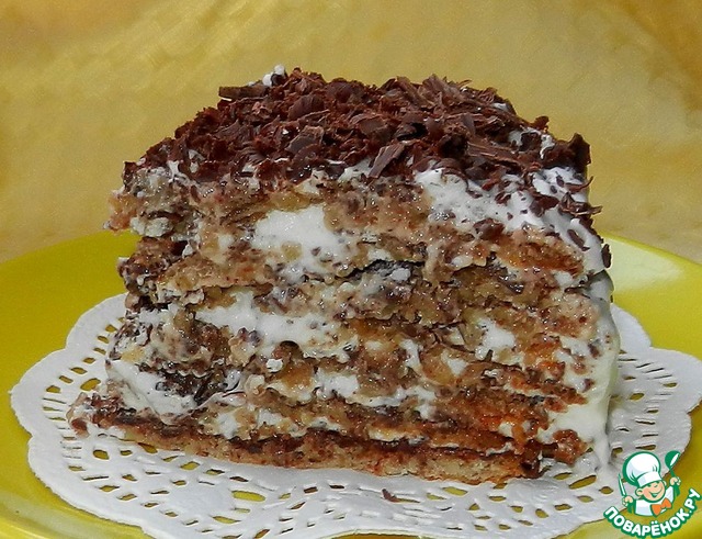 Промазать сливками с шоколадной крошкой 5 смазанных шоколадом коржей, сложить их друг на друга.
