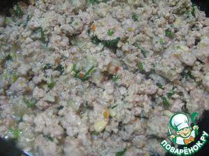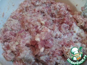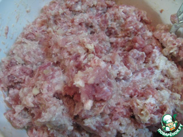Для начинки: сделать фарш (через мясорубку) или мелко порубить репчатый лук, чеснок, мясо.