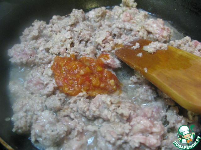 Выложить фарш (или порубленные мясо, лук, чеснок) и жарить на сковороде с добавлением масла 7 минут. Добавить томатную пасту.