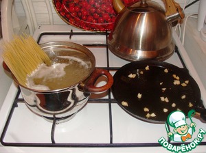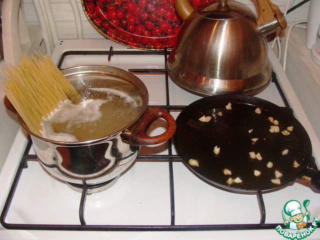 чеснок чистим, режем на кусочки и обжариваем в оливковом масле для аромата. -