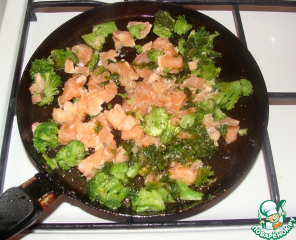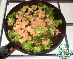 Затем чеснок аккуратно удаляем лопаткой, а в сковороду с маслом выкладываем брокколи, немного обжариваем, затем кладем нарезанный на кусочки лосось и зелень, держим на огне 5-7 минут.