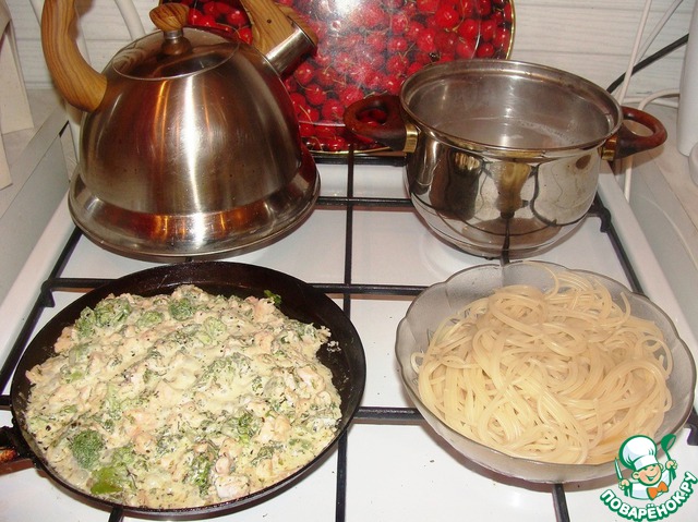 Выкладываем спагетти, сваренные al dente, в глубокую миску, добавляем полученный соус и тщательно перемешиваем.