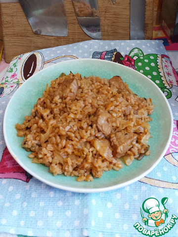 Минут через 15 добавляем в сковороду нашинкованную капусту, рис и томатный сок. И тушим блюдо до полной готовности риса. В самом конце добавим любимые специи, и можно обедать.