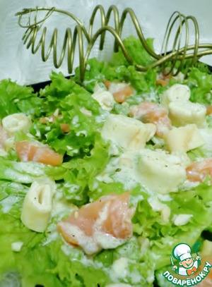 Рыбу нарезаем тонкими полосками и присоединяем к салату и блинам. |