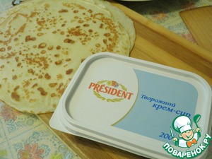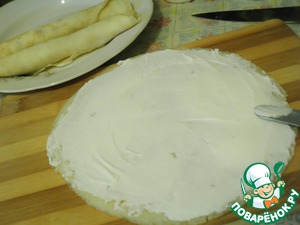Блины хорошо смазать сливочным сыром или пюре. Свернуть их рулетиком и нарезать на кусочки, толщиной примерно 1 см. |
