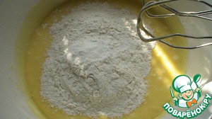 Муку с разрыхлителем просеять в миску. Порционно добавляем во взбитую массу и вымешиваем.
