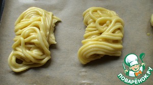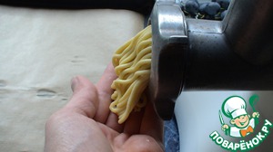 Пропускаем тесто на мясорубкe и отделяем ножом по форме печенья.