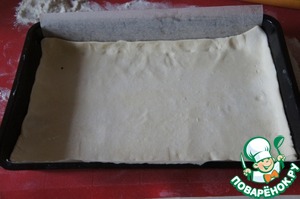 Тесто раскатать на 2 пластины размером примерно 25-30х35-40 см. -