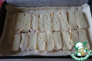 Прямоугольную форму или противень смазать растительным маслом и застелить пекарской бумагой. Выложить одну пластину теста. Сверху плотно выложить ломтики камамбера, оставляя свободными края примерно 1-1,5 см.