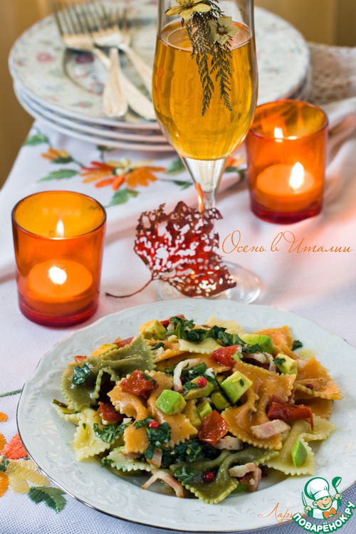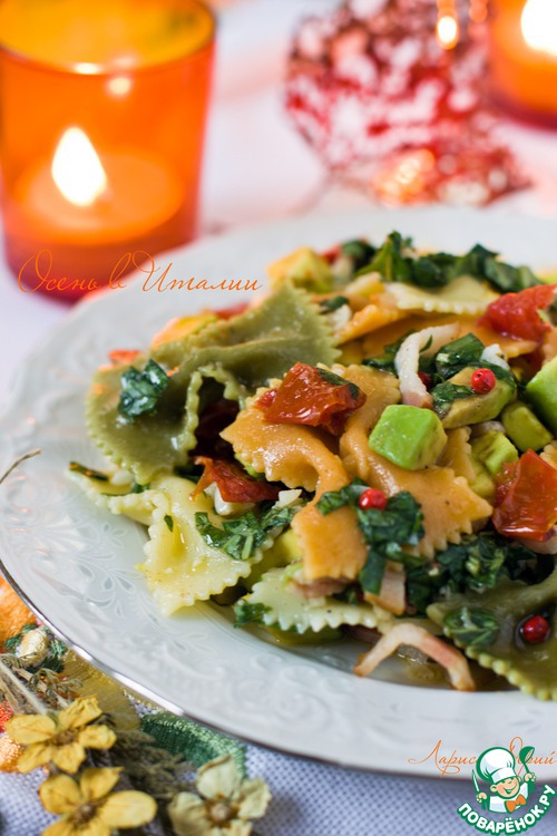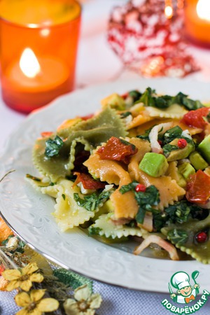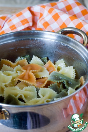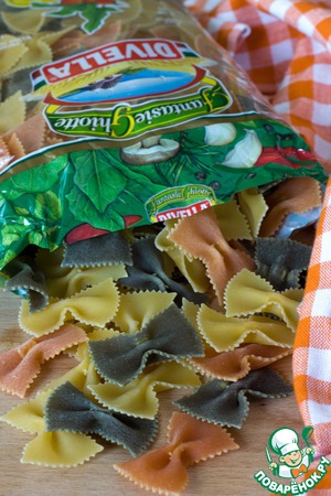 Макаронные изделия можете выбирать на свой вкус и кошелек. Я брала вот такие бантики от Divella. Для этого салата от себя порекомендую именно их, поскольку эти фарфалле не развариваются, прекрасно держат форму после отваривания, а также содержат в составе не искусственные красители, а натуральные - шпинат и томаты.