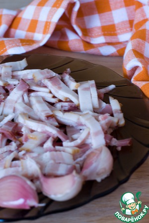 Пока варится паста, кладем на противень разрезанные пополам помидоры, бекон и неочищенный чеснок, поливаем помидоры 1 ст. л. оливкового масла и запекаем при 200 градусах в течение 20 минут. Если есть вяленые помидоры, берите их. Тогда ничего запекать не надо. Я именно так и поступила, а бекон нарезала, положила вместе с чесноком в тарелку, накрыла салфеткой, чтобы жир не разбрызгивался и поставила в микроволновку на 1 минуту на максимальную мощность. Если будете запекать помидоры, то имеет смысл начать приготовление салата именно с этого шага, поскольку паста сварится быстрее, чем запекутся помидоры, и сильно остынет к моменту подачи.