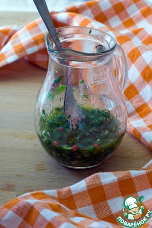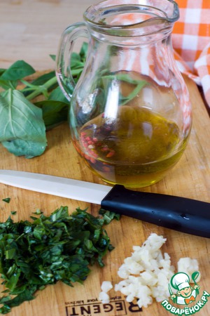 Теперь готовим соус. Вливаем в подходящую емкость оливковое масло (можно от вяленых помидоров), добавляем уксус, перец - черный молотый и розовый (если есть), измельченный печеный чеснок, соль, рубленый базилик, сахар (по желанию).