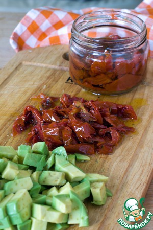 Нарезаем на кубики авокадо, измельчаем вяленые томаты (у меня - собственного производства, этакий Home Hand Made).