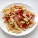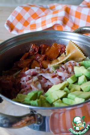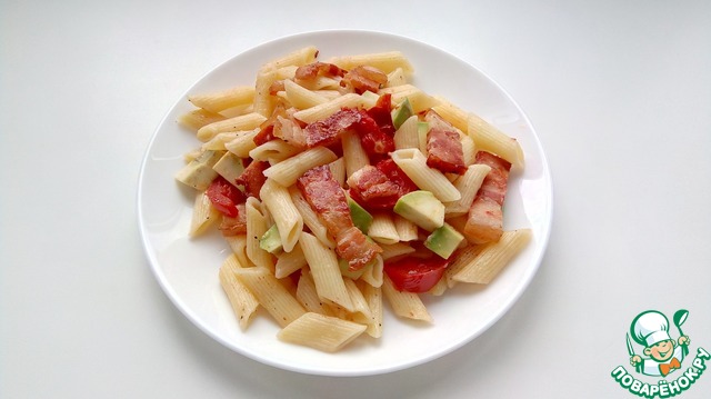 Кладем бекон, авокадо, томаты и соус к пасте, все аккуратно смешиваем.
