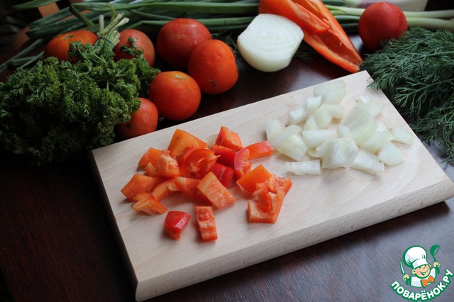 Лук и перец нарезать кубиками по размеру фасоли, обжарить на небольшом количестве оливкового масла примерно 5 минут.