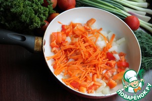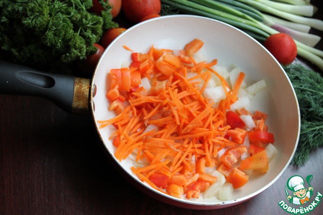 Добавить морковь, натёртую на крупной тёрке и продолжать обжаривать.