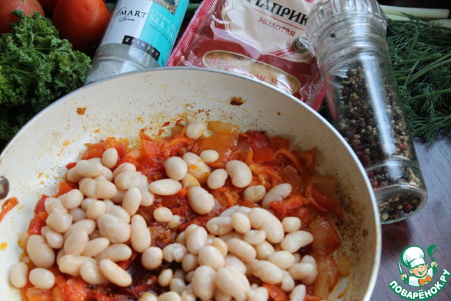 Когда помидоры приобретут более однородную консистенцию добавить соль, сахар, перец молотый, паприку и отвареную фасоль. Протушить 3-5 минут, выключить огонь и накрыть крышкой.