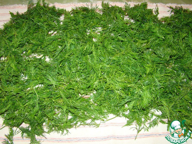 Дальше – просушка. На столе расстилаем кухонное полотенце и выкладываем нашу зелень для окончательной просушки. По времени это займет 1 -2 часа. За это время желательно несколько раз встряхнуть, перемешать руками зелень, поднимая нижние слои наверх.