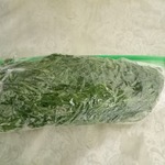 Вот так выглядит замороженная зелень через сутки. Обратите внимание, она совершенно не содержит льда, кристалликов снега, по структуре рыхлая и мягкая. Не стала нарушать форму, так как в таком виде он (пакет) отлично разместился среди остальных пакетиков в морозилке.