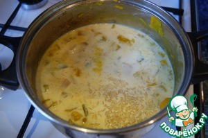 Затем вливаем молоко, промытый рис и варим еще 30 минут.